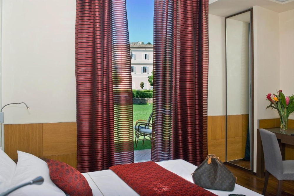 Classic room with air conditioning and an LCD satellite TV. Bathroom features with a Jacuzzi shower. Offers relaxing views of the inner garden, or views of the Roman Forum.
